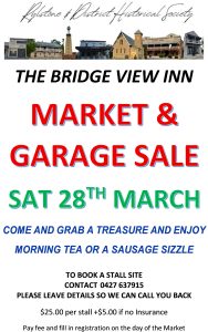 We will be hosting a Market and Garage Sale on Saturday, 28th March 2026, in the grounds of the Bridge View Inn, Louee Street, Rylstone.